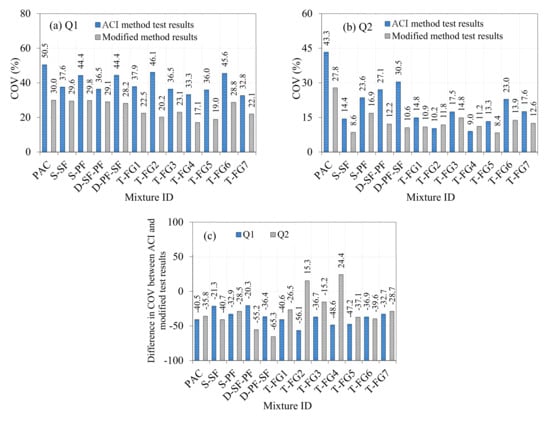 COV results of the ACI and the modified technique impact tests are compared (a) Q1, (b) Q2, (c) Percentage difference ACI and modified test results.