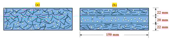 Advancement in materials science has increased the advent of novel forms of composite materials known as functionally graded concrete (FGC), with the possibility of utilizing them in many engineering fields []. Fibrous concrete is used successfully in construction, and extensive research has been conducted worldwide to explore its strength and durability []. An evolution of fiber-reinforced concrete with better advancement is called functionally graded fibrous concrete (FGFC). Innovating concrete composite with improved mechanical properties, such as FGFC, ensures the necessary behavior by changing its properties. A higher density with a strong fiber matrix can be achieved in FGFC, which exhibits excellent properties, namely, impact resistance, toughness, and uniaxial tensile strength []. Moghadam and Omidinasab [] investigated the behavior of FGFC slabs comprising 1% dosage of steel fiber, nylon fiber, and a hybrid combination. In comparison with steel fiber, nylon fiber showed less increase in FGFC flexural strength. Nylon, steel, and hybrid fibers enhanced flexural strength 1.2, 2.6, and 1.7 times, respectively. A significant enhancement in the flexural strength was observed in FGFC compared with conventional fibrous concrete. This enhancement is due to the fiber bridging action.