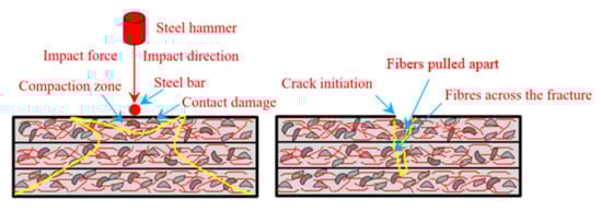 The effects of damage observed in the specimens against impact loading were contact damage, matrix failure, fiber failure, and fiber debonding/delamination. These damage effects happened in a short time, and hence, it is hard to describe their proper sequence [,]. The damage mechanism for the aforementioned effects is illustrated in Figure 18, which includes localized damage at the contact point between the load transfer steel rod and the specimen. Delamination occurs in the internal structure as a result of transverse shear stress/strain. Tensile wave transfer during impact causes failure of the matrix and fiber debonding/delamination to the surrounding zones caused by compressive and tensile bending at the top and bottom surfaces, respectively. Fiber debonding/delamination is one such vital phenomenon of failure that disturbs the integrity of the matrix composite []. Additionally, more energy is dissipated by these fibers during secondary crack development, which is highly complex to identify at the time of service. When the first crack is initiated, transfer of substantial kinetic energy occurs in the fibers, which can restrict crack evolution and energy distribution to adjacent areas [].
