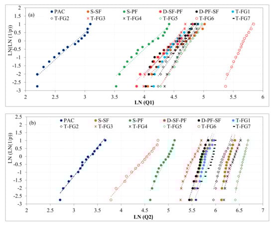 where c is the specimens’ serial number, and n is the total number of tested specimens. Figure 19 shows a graph between ln[ln(1/p)] and ln (Q1 and Q2). With the use of the least-square approach, we were able to find a linear fit and then use it to calculate the form parameter (see Figure 19). Equation (11) may be used to estimate the scale parameter by finding the line intersection in the ln[ln(1/p)] axis and writing it as follows: