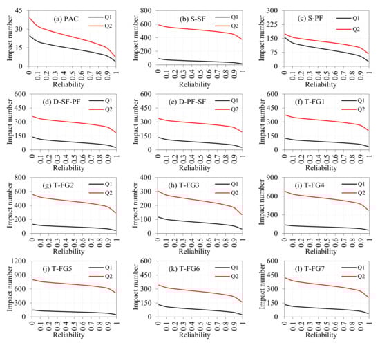 Q1 and Q2 in terms of reliability (a) PAC, (b) S-SF, (c) S-PF, (d) D-SF-PF, (e) D-PF-SF, (f) T-FG1, (g) T-FG2, (h) T-FG3, (i) T-FG4, (j) T-FG5, (k) T-FG6, (l) T-FG7.
