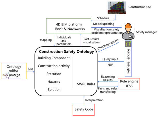 In recent years, advanced information technologies such as BIM, ontology, NLP (Natural Language Processing) are introduced in the construction industry to improve production efficiency. Ontology, which can be interpreted as a knowledge description model, was originally derived from the field of philosophical concepts. A complete ontology consists of at least five parts: concept or class, relation, function, axiom, and instance. An instance is a concrete instance of a concept [6]. Ontology has been widely used in information retrieval, semantic web, knowledge management, digital library, and other fields. As an important knowledge representation model, ontology technology has been widely studied in the field of construction safety management, especially in information reasoning and extraction. Wang and Boukamp (2011) [7] established an ontology for analysis of potential job hazards, including construction activities and specific operation steps, and established a set of ontology reasoning mechanisms to realize the safety inspection of construction activities, with which the response rate of construction companies to construction activity risks was improved. To identify specific safety risks and automatically generate safety measures, Lu (2015) et al. [8] established five categories of CSCOntology (construction safety checking ontology), including the line of work, task, precursor information, hazard, and solution. The rules regarding high falls as promulgated by OSHA (Occupational Safety and Health Administration) were first translated into SWRL (Semantic Web Rule Language) rules that can be processed by computers, the JESS inference machine was then used to realize the inference for a given instance of ontology and generate corresponding solutions. However, the information needed for detection still needs to be created and entered manually, implying an insufficient degree of automation. Kim et al. (2016) developed a BIM-based scaffolding automatic planning system. The system used simulation engines and BIM to simulate daily construction progress and identify potential hazards according to safety specifications. Zhang (2015) et al. [9] proposed an automatic safety planning system combining BIM and ontology. This system established the mapping between BIM components and concepts in the ontology and then used SWRL rules in the ontology to carry out a safety inspection on automatically extracted masonry components in BIM and give a visual results report. In 2016, Ding et al. [10] applied ontology technology and semantic network technology in the safety risk management of deep foundation pit construction. There are several shortfalls in the current research of ontology applications in construction safety management. Firstly, the information for reasoning using ontology either comes from manual input or is extracted from a static BIM model in the phase, both of which cannot represent the dynamic nature of construction safety management. Secondly, a limited range of construction safety management is covered in current research, with emphasis on falls from height and border identification. Lastly, the results of safety checking are presented in the form of databases or tools for ontology reasoning, which imposes restrictions on construction managers who are not familiar with such tools.