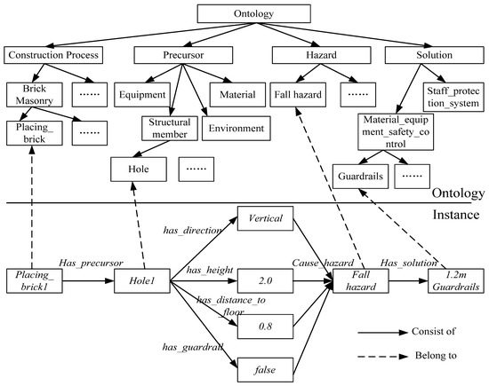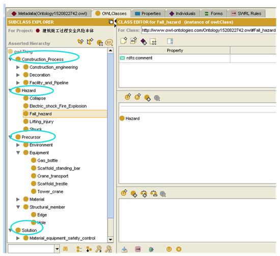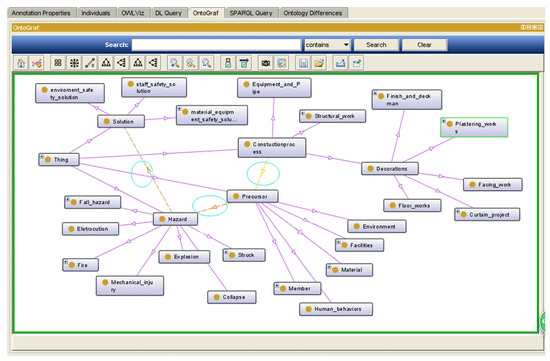 Object property: the ontology established in this paper included 4 major categories, and the logical relationship between the 4 categories can be expressed by 3 relational terms. Some construction processes or precursors generated by unsafe construction state can be expressed by “Has_precursor”; the precursor may cause construction safety accidents (hazard), thus “Cause_hazard” can be used; and construction accidents (hazard) occur, which need corresponding countermeasures (solution) to prevent or solve, thus “Has_solution” can be used to express the relationship.
