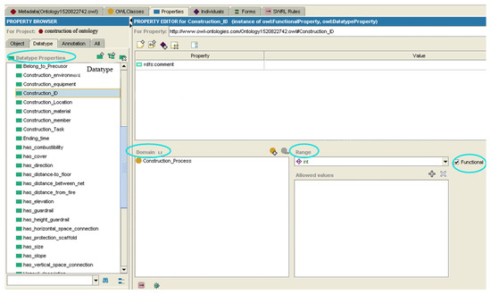 With the object and datatype properties of the ontology class established above, the ontology was then stored in Protégé. Figure 4 shows the data type attributes of the construction process number (Construction_ID) in the construction process class.