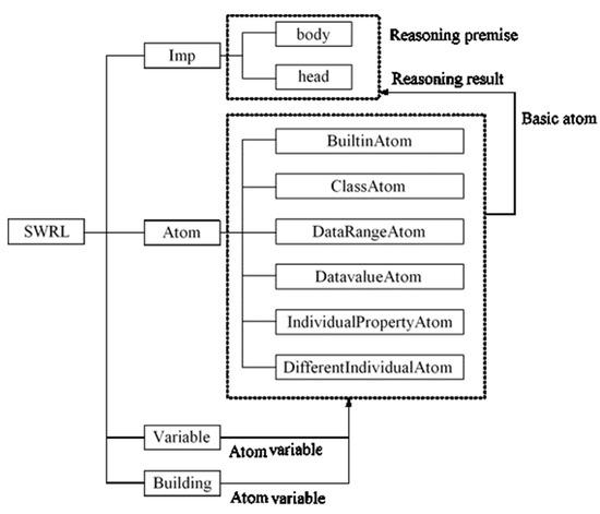 The semantic web rule language (SWRL) is a language that presents rules in a semantic way. SWRL integrates the ontology description language OWL Lite, OWL DL (description logic), and Datalog RuleML. SWRL is human-readable with the advantages of the rule editing function combined with the elements defined in the ontology to improve knowledge expression and reasoning [24]. The SWRL consists of 4 parts: Imp, Atom, Variable, and Building, as shown in Figure 5 [25].