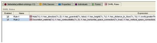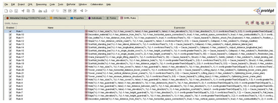 The ontology established in this paper included 4 categories: construction activities; precursor information; risk accidents; and solutions. The links formed by these 4 categories lay the premise for the establishment of SWRL rules. The elements (Atom) used in a complete SWRL rule for accident subjects, attributes, discriminant parameters, and prevention measures came from the 4 major classes of ontology, and the specific discriminant conditions or parameters were obtained in the interpretation of the safety rules. Taking the unprotected wall holes as an example, they were caused by the construction work brick masonry in the paving ash masonry and other construction steps for the outer window and other reserved holes. If the bottom edge of the hole was more than 2 m wide and the distance from the bottom of the floor was more than 80 cm without proper protection, accidents such as falling from a height may occur. The solution was to add a 1.2 m high protective railing around the hole in accordance with the specifications. The corresponding rule in SWRL database can be expressed as shown in Figure 6. The results of the complete set of safety rules for fall from height in the Protégé plugin SWRLTab developed in this study are shown in Figure 7. This paper also builds an SWRL safety rule base containing 5 major incident identifications in accordance with this process, as shown in Figure 8.