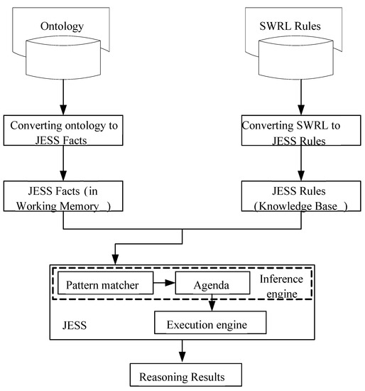 When given specific domain rules and facts, the rule-based reasoning engine can be used to complete the corresponding reasoning tasks. However, the safety rules expressed by the SWRL rule language and the fact knowledge expressed in the form of ontology cannot be understood by JESS; thus, it was necessary to convert the SWRL rules and facts into the knowledge format supported by JESS to realize the reasoning. When the JESS inference engine is activated, the inference process begins. Pattern matching was used to determine what rules were executed and when to execute, after which the Agenda executes the commands in the activated rules. Then, the execution engine completes the execution of the rules. The processes are illustrated in Figure 10, which are then implemented in the case study.