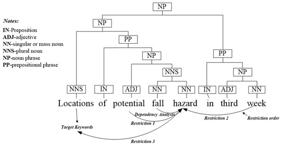 (3) Parsing, designed to capture the relationship between words, forms a syntactic tree of queries through the Stanford parser. The NLP tool was used to obtain the relationship of different words in the sentence to form a syntactic structure tree. The results of the syntax analysis are shown in Figure 11, where IN, ADJ, NN, NNS, NP, and PP represent prepositions, adjectives, singular nouns or uncountable nouns, plural nouns, noun phrases, and prepositional phrases, respectively.