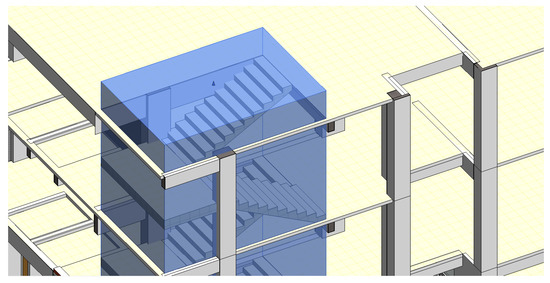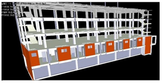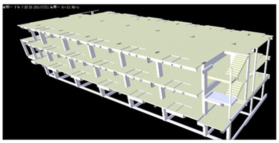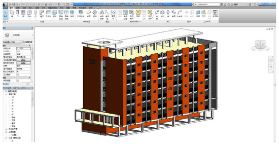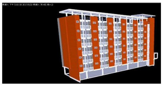 This paper chose the student dormitory building (C3 building) of the commuter college of a university as a case to demonstrate the framework. The student dormitory building (C3) covers an area of approximately 827.2 square meters. It extends seven floors above the ground and one floor below the ground. Each story height was 3.3 m, and its basement height was 3.6 m. The three-dimensional model of the dormitory building, which was generated in the Revit software (license number: 559-06926929), is shown in Figure 12 below.