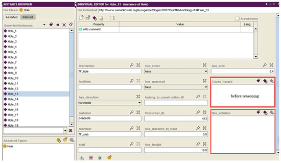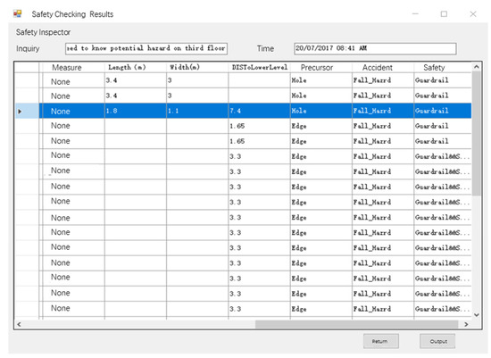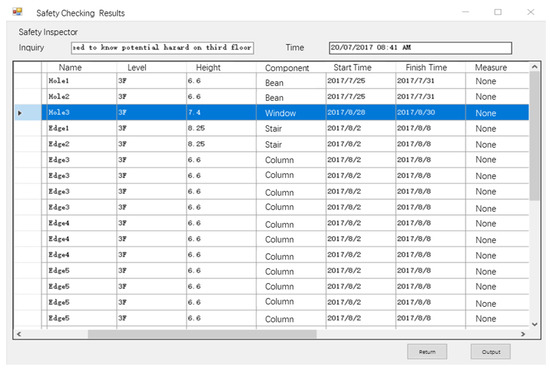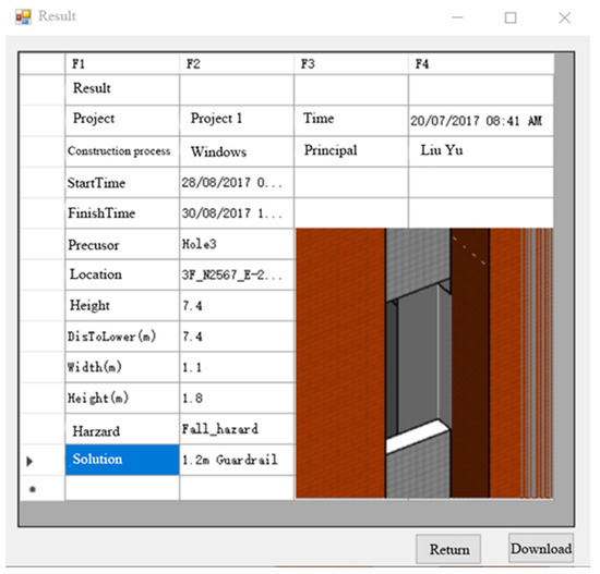The automatic identification process was performed by scanning the construction process files containing time information by the developed framework, which established the connection with the top-level components according to the detection rules of the openings and extracted the relevant parameters. The results from the reasoning are shown in Figure 19. Under the implementation of a reasoning engine, the safety parameters can be identified automatically, and the risks and solutions can be identified (Figure 20).