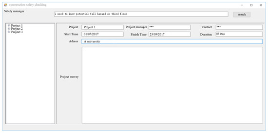 The NLP-based query system to present the identification results of related risks according to the user’s requirements was then illustrated. The login interface and the query interface are shown in Figure 21 and Figure 22, respectively. This paper takes the query statement “I need to know about any potential hazards on the third floor” as an example to show the query results (Figure 23 and Figure 24) and query reports (Figure 25). The project manager of the case study stated that the developed plugin was user-friendly, and the results could help improve the construction safety management since they were rational according to their experiences and requirements. Similar to many other industries, people tend to use a system that can make their queries easily without previous knowledge of semantic technologies [27].