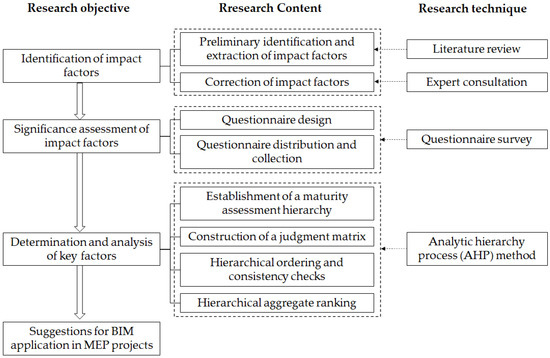 This section describes the research framework. First, it identifies the impact factors through literature analysis and expert consultation. Second, a questionnaire survey has been conducted to collect the experts’ evaluation on the importance of the impact factors, including questionnaire design, and questionnaire distribution and collection. Third, it explains the specific implementation process of the AHP method to hierarchically rank the impact factors. Figure 1 illustrates the research flow of this study.