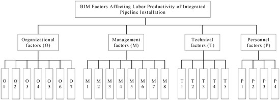 This paper initially identified 26 influencing factors referring to literatures in academic journals, documents such as the National Building Information Modeling Standard (NBIMS), and the information sources of other projects. The analysis of literature shows that the impact factors can be divided into five categories, including organizational, industry environment, project, management, and personnel [29,30,31,32], which provides a basis for the comprehensive evaluation of factors. However, for different project management requirements, the specific classification and weight of factors affecting labor productivity are quite different. Based on the literature analysis and the characteristics of MEP engineering with BIM application, the extracted factors were initially divided into four categories: organizational, management, technical, and personnel.