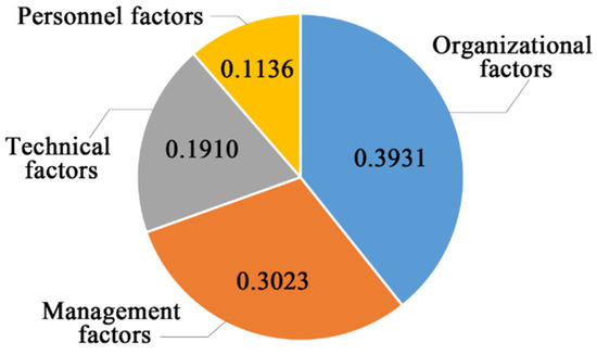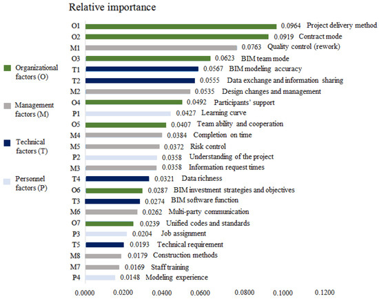 As shown in Table 8, in category-level factors, the organizational factors (O) and management factors (M) are more significant compared with other factors. This is compliant with research that indicates organizational factors are key to achieving project goals and increasing productivity [25,64], as organizational factors determine contract mode, project delivery method, and team ability, etc. Major challenges for successful MEP coordination with BIM are related to management aspects, such as the lack of clarity about roles and responsibilities in coordination [24], and the difficulty to define and achieve sufficient levels of detail for each discipline [9]. It shows that management and organization factors that facilitate coordination based on BIM have the greater impact on productivity than technical aspects. The personnel factor (P) is relatively less critical as most BIM users receive basic BIM software training and do not show significant differences in the level of operation. The weights of category-level factors are shown in Figure 3.