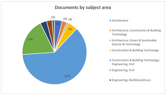 Academic documents, journals, and conference papers related to building information modelling were extracted using the keyword search strategy from the Web of Science database. The Web of Science database allows to browse and sort required documents by subject area, and statistics display that 62% was related to Construction & Building Technology and 22.9% was related to Engineering, Civil, as shown in Figure 2.
