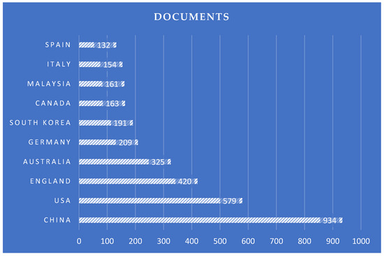 The publishing profiles of the top ten nations in the BIM research topic throughout the world’s regions are shown in Figure 4. Asia (China 934, South Korea 191, and Malaysia 161) had a combined output of 1286 published documents, North America (USA 579 and Canada 163) had a combined output of 742 published documents, and Europe had a combined output of 915 published documents, including 402 from England, 209 from Germany, 154 from Italy, and 132 from Spain. While Australia has 325 papers, Brazil has the most in Latin America with 46 papers. While not complete, this list illustrates the nations and continents where BIM research is currently being conducted.