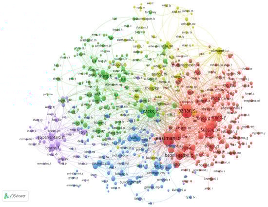 The VOSviewer tool is capable of analysing and visualising a scientific research field in order to logically comprehend a cohesive and organised knowledge structure. This method is widely recognised as a useful systematic review approach for revealing hidden implications in massive amounts of data. Additionally, VOSviewer is a powerful tool for mapping the knowledge domain and generates various network maps in a systematic manner [30]. As a result, VOSviewer is used to generate a network of co-citations and perform abstract clustering analysis in this systematic review. Kleinberg created VOSviewer in 2003, and the application has since been updated to include a burst detection algorithm. The author co-citation network diagram illustrates the relationship between authors whose works are cited in the same document. The author’s co-citation network is depicted in Figure 6, which contains 650 nodes and 122,821 links. As previously recommended, network pruning was performed using the pathfinder function to eliminate superfluous links [31]. Thus, node size represents each author’s co-citation frequency, and connections between nodes reflect citation relationships created by the number of citations. The top-ranked author is [32], with citation counts of 377. The second one is [33], with citation counts of 337. The third is [34], with citation counts of 313. The fourth is [35], with citation counts of 289.