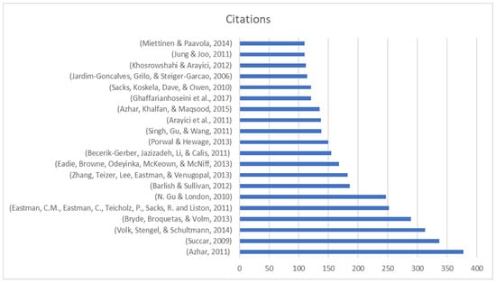 Figure 3 shows the number of published documents each year. Publications in building information modelling exhibit an upward trend between 2000 and 2021, and the highest number of publications occurred in the years of 2021 and 2020, with 81 and 76 published documents, respectively. The following figure shows the extent of researchers’ interest and the increase in the number of research in the field of BIM as well as its relation to collaboration and risk in recent years and the multiplicity of areas that can be researched and contribute to promoting the uses of BIM in the field of construction projects.