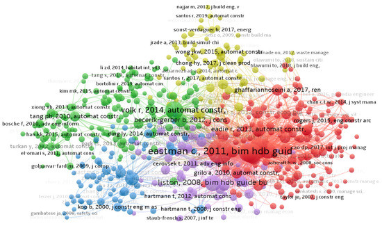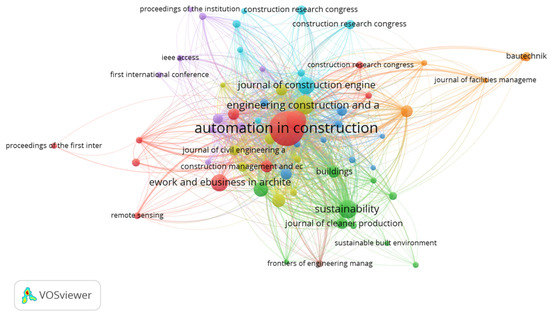 Journal co-citation analysis using the VOSviewer was carried out, and a journal co-citations network was created with 116 nodes and 1721 links. As shown in Figure 8, the node size represents citation frequency, as the most cited journals offer more significant nodes on the network. The top-ranked journal by citation counts is the Automation in Construction, with citation counts of 15,658. The second is the journal of information technology in construction, with citation counts of 1826. The third is the journal of construction engineering and management, with citation counts of 1810. The fourth is international journal of project management, with citation counts of 1306. Finally, the fifth is advanced engineering informatics, with citation counts of 1273. It is noticeable that all of the most cited journals are also among the top source journals publishing articles for building information modelling.
