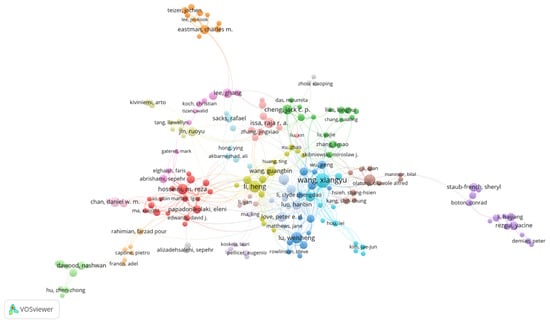 As shown in Figure 10, a co-authorship network was formed based on writers who have made important contributions to BIM research and trends. The software function required a minimum of five papers to be deemed noteworthy, with a minimum citation of five. A total of 296 of the 8213 authors of 2890 documents fulfilled the relevance criterion. Table 2 shows a list of the most prolific writers in this field of study. The number of publications, citation scores, and link strength were used to determine the research impact.
