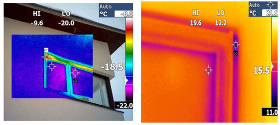 One of the ways to effectively renovate buildings is to apply new high-performance windows. However, judging from experience, the low energy efficiency is often related to low quality of construction. Correct window installation is still one of the most difficult hurdles that must be overcome to achieve a higher energy efficiency in buildings [7]. Thermal imaging performed by professionals clearly shows thermal bridges at window openings (Figure 1) [8].