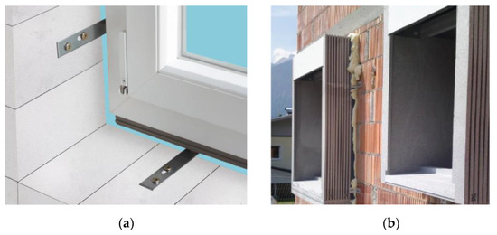 Nowadays, a few alternative installation solutions are applied in the practical area of construction. Most window frameworks are pendent on reinforced anchor brackets (Figure 2a) or on rectangular wooden frames (chipboard) (Figure 2b) that are installed on a wall. However, these different cases of window mounting do not ensure that thermal bridges at the junction of wall and window will be avoided. Insufficiently isolated joints of window frames and facade walls increase the impact of building thermal leaks, and it does not ensure the required value of the airtightness of passive house, which must be equal to 0.6 air change rate at 50 Pa per hour. Furthermore, it is important to mention that the possibility of condensation and humidity increases when using the mentioned window mounting methods [23,24]. In this way, the building may lose its passive house status because of window installation defects [25,26].