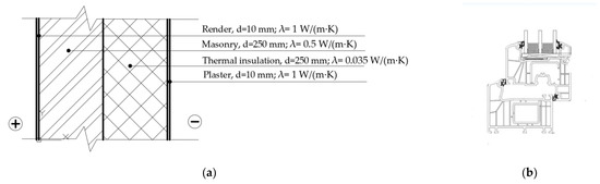 The schemes of the investigated wall structure and the window frame are given in Figure 3. Additionally, the values of the layer’s thickness and thermal conductivity coefficient are shown in the same figure. Accordingly, the heat transfer coefficient of the wall structure is U = 0.12 W/(m2·K).