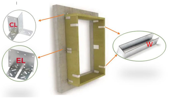 The installation of a window on the wall’s opening using stone wool boards (SWB) was chosen for the study (Figure 4). The thermal conductivity coefficient of the special rigid SWB is λ = 0.059 W/(m·K). The window frame fastener W length is 192 mm; width—50 mm; wall thickness—2 mm; thermal insulation thickness—48 mm. The length of the corner fastener CL of the thermal insulation panels (when the thickness of the thermal insulation layer was > 200 mm) is 192 mm; width—192 mm (respectively 96 mm on one side of the corner); wall thickness—2 mm. The thermal insulation board interconnect EL length was 192 mm; width—192 mm; wall thickness—2 mm. The investigation evaluated two wall installation fasteners measuring 80 × 100 mm. The calculations estimated one wall installation fastener measuring 80 × 100 mm. This method of installation does not require gaskets, as the thermal insulation material is flexible and allows the window frame to be installed tightly.