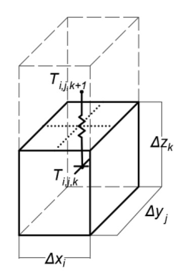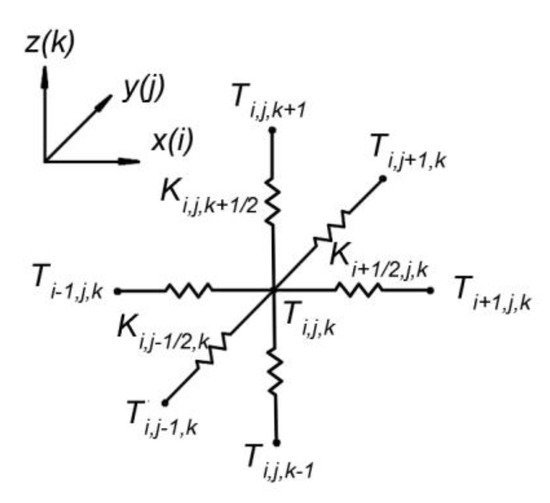 Figure 7 shows the six-thermal conductance of cell (i,j,k). The conductance Ki,j,k+1/2, (W/K), between the two cells (i,j,k) and (i,j,k+1) is calculated as [38]: