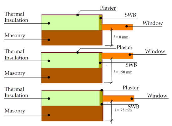 The authors of this study analyzed the installation of windows using SWB. The study results revealed that the insulation of the window frame was a very important issue related to the energy consumption of the building. By insulating the window frame with SWB, it was possible to reduce the value of the thermal bridge at the junction of the wall and the window framework by 80% (but not 100%). Meanwhile, other researchers who have examined the issue of the thermal bridge of the window opening have stated that for some cases, placing the window in the most energy-efficient position reduces the linear thermal transmittance by more than 50% [41].