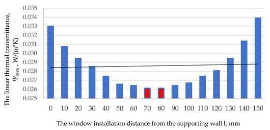 By analyzing the dependence of the LTB on the window installation length in the thermal insulation material, the obtained results show (Figure 9) that the lowest value ΨSWB is obtained when the window-mounted place is at a distance of 70–80 mm from the load-bearing layer. The thermal transmittance average slowly increases, moving along the thermal insulation layer to the edge of the load-bearing layer.