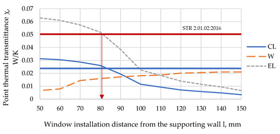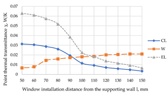 By assessing how the values of the χCL, χEL, χW48 depend on the distance between the window installation and the edge of the load-bearing layer wall for separate window mounting elements CL, EL, W, the research results (Figure 10) show that using corner fastener CL and interconnect fastener EL, the PTB is the highest at a distance of 50–100 mm from the load-bearing layer (χCL = 0.0313 W/(m·K) and χEL = 0.0629 W/(m·K)). Meanwhile, the lowest values are obtained when l = 150 mm (χCL = 0.0034 W/(m·K) and χEL = 0.00606 W/(m·K)). However, analyzing the PTB of fastener W, the results are the opposite. As the length l (length between the installed window framework and the load-bearing layer) decreases, the value of the PTB decreases, with a maximum value χW = 0.021 W/(m·K) and minimum χW = 0.0067 W/(m·K) at l = 150 mm and l = 50 mm, respectively.