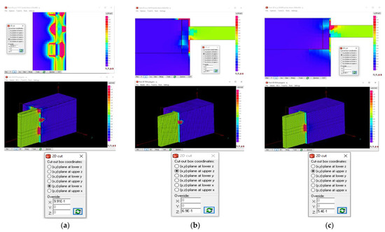 The LTB around the openings was calculated using the 2-D software THERM [36]. This method is based on the 2-D dimensions. The heat flow moves horizontally in the x- and y-axis directions. The linear thermal transmittance of the thermal bridges (Ψ) was calculated according to Equation (1):