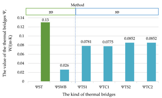 The authors compared the obtained values of the thermal bridge by using the 2-D and 3-D calculation methods, and the calculation results using a 2-D environment showed that ΨSWB = 0.026 W/(m·K), while in the 3-D environment, this value was accordingly, ΨT = 0.0815 W/(m·K). The difference was 68%. From the results of this study, one can conclude that by ignoring PTB and using metal elements for window mounting, a significant difference can be obtained between the calculated (2-D method) and the expected real heat loss (3-D method). This fact is confirmed by other scientists [42].