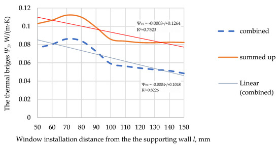 The results (Figure 13) also show that in the calculations, applying the summing (calculation option (1)) of thermal bridge values (ΔΨS2) and the value of thermal bridges of the window mounted in the thermal insulation layer at a length of 50–100 mm from the load-bearing layer was 28% greater than the window mounted in the span of 100–150 mm. The highest value of the thermal bridge (ΨTS2 = 0.1122, W/(m·K)) was at a length of 70 mm from the load-bearing layer, and the lowest value of ΨTS2 (0.0820, W/(m·K)) was at a length of 130 mm from the load-bearing layer.