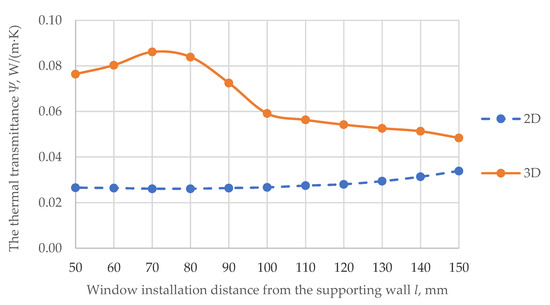 An analysis was also performed showing how the values of thermal bridges were distributed by changing the installation place of the window in the thermal insulation layer. Changing the place of the window installation was evaluated in the calculation. A value of 0 mm means that the window is mounted next to the edge of the load-bearing layer, and a value of 150 mm means that the window is installed right outside the wall (thermal insulation layer). Therefore, 75 mm denotes the middle of the thermal insulation layer (Figure 8). The values of the longitudinal thermal bridge in the thermal insulation layer were calculated starting from a value of 0 by adding 10 mm towards the outer side of the barrier, i, from 0 + 10i + 10j… + 10n = 150 mm.