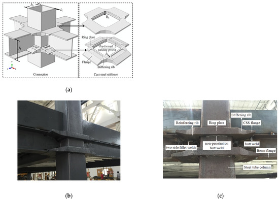In order to solve the above problems, an H-shaped beam to square tube column joint with cast steel stiffeners (CSS) (shown in Figure 1a) was proposed [8]. The CSS consists of three parts: (i) a ring plate connected to a steel tube, (ii) flanges connected to flanges of the H-shaped steel beam, and (iii) stiffening ribs between the ring plate and the flanges. The reinforcing ribs are rounded to reduce the stress concentrations induced by the stiffeners. The ring plate is provided with a prefabricated welding groove that is connected to a square steel column by a non-penetration butt weld applied along the pre-formed welding groove. Beam flanges are connected to CSS flanges by butt welds, and beam girder webs are connected to column webs by two side fillet welds. The flat surface of the upper CSS has the same height as the upper surface of the beam flange. The presence of CSS has no effect on other aspects of construction, e.g., metal decking and floor slabs. The stiffener can be considered a section of a beam flange during the process of construction. The CSS joint in a real structure is shown in Figure 1b. This beam-column joint with CSS has a convenient production method and a simple installation process.