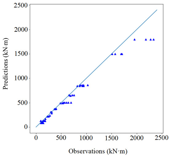 The relationship between the actual observations and the predictions from the simplified theoretical model by using Equation (1) is shown in Figure 2. The figure shows that Equation (1) underestimates the moment capacity overall. The gap between Ma and Mp1 tends to increase with the magnitude of Ma. For example, 72% of the joints with Ma < 500 kN·m are underestimated, while 100% of the joints with Ma > 1500 kN·m are underestimated. In addition, the predictions Mp1 of different joints are always the same, while the observations Ma of them are different, e.g., Mp1 = 1500 kN·m for those joints with Ma of 1509.71 kN·m, 1566.02 kN·m, 1684.23 kN·m, and 1704.18 kN·m. The unreasonable model performance implies that some important feature variables are possibly not included in the model.