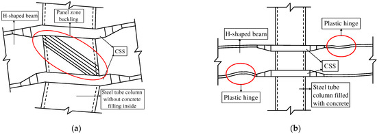 Damage mechanism diagrams: (a) joint with thin wall column without concrete filled inside; (b) joint with thick wall column filled with concrete.