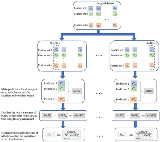One more step after obtaining a valid probabilistic capacity model is to quantify the importance of different feature variables. This paper proposes to use a permutation-based approach, as this approach (1) is flexible and works for different types of probabilistic models (linear, nonlinear, and also non-parametric models), and (2) does not require further model training or tuning processes [37,38]. Figure 6 shows the flowchart of the permutation-based approach used in this paper. Starting from the original dataset for a capacity model that has J feature variables and n samples in total, the proposed approach (1) builds J new feature spaces in which the jth feature space (j = 1,2,…,J) consists of randomly shuffled values for the jth feature (denoted by in the figure), and original values for the rest; (2) makes predictions of the target variable using each of the J feature spaces for all the n samples (denoted by in the figure), and calculates a total loss-related metric (i.e., MAPE in this paper [39,40]) for each feature space, denoted by for the jth feature space; (3) calculates the increase in MAPE with respect to the one using the original dataset () for each of the J feature spaces (denoted by in the figure); (4) and, finally, normalizes each relative increase in MAPE by the following equation to obtain an importance score for each feature variable: