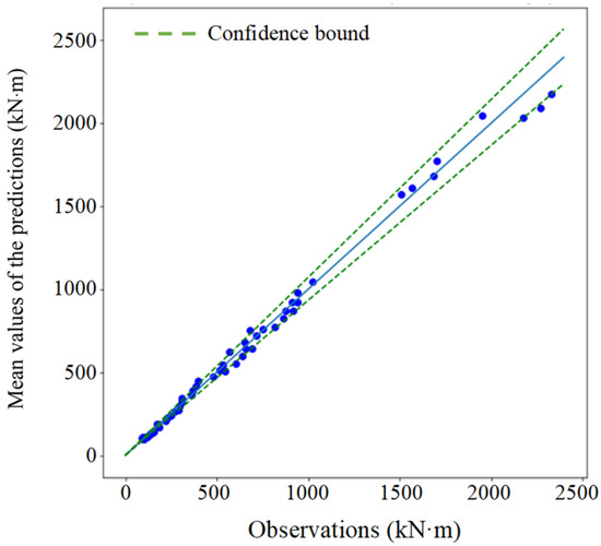 where C is the target capacity, i.e., moment bearing capacity; is a normal transformation, e.g., Box–Cox transformation [30]; x represents the feature variables; are model parameters to be estimated in which is the standard deviation of the model; is a deterministic term (no parameters or uncertainties to be estimated); is a correction term to correct the bias in ; and is the model error in which is a standard normal random variable. Note that and are not always necessary in a capacity model. For example, when there is no empirical formula available or the parameters in the empirical formula require a refit, one can set = 0 and only train a model with . When the empirical formula is unbiased and accurate enough, one can consider no correction term and use to capture the mean trend and the associate model uncertainties [27].
