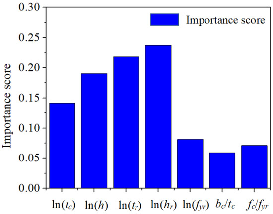 Importance scores for different feature variables in the proposed model are calculated following Section 4.3, and the results are presented in Figure 9. In Figure 9, the parameters in order of importance are hr, tr, h, tc, fyr, fc/fyr, and bc/tc. The hr, tr, and h are the most important parameters, which are already demonstrated in the previous simplified theoretical model in Ref. [5,14,15,16,17], while tc, which is more important than fyr, is not included in the previous model. That is one of the reasons why the previous model is biased and less accurate than the proposed model. This feature importance analysis can demonstrate the importance of the parameters in a quantitative way.