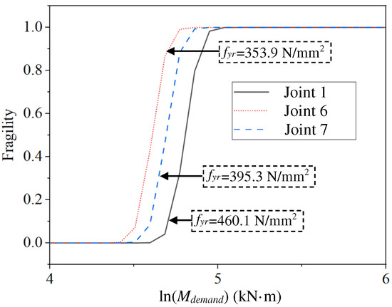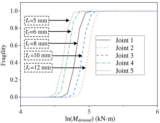 Figure 10 illustrates how the fragility varies with column thickness tc for the joints in Group 1. As an example, when the demand ln(Mdemand) is 4.772 kN·m, the fragilities of joints 1–5 with a thickness of 8 mm, 12 mm, 10 mm, 6 mm, and 5 mm are 0.326, 0.001, 0.031, 0.881, and 0.981, respectively. The fragility increases with a decrease in column thickness; namely, the joints with smaller thickness are more likely to be damaged. Similar analyses are conducted for joints in other groups, which are shown in Figure 11, Figure 12, Figure 13 and Figure 14. The results show that the fragility decreases with an increase in fyr, fc, hr, tr, bc, and h.