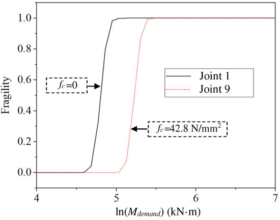 Fragility curves of example joints with and without concrete filling.