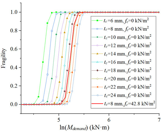 Another practical value of fragility is to provide different designing or retrofitting plans with the same reliability, to support the engineers or researchers with decision-making. For instance, both filling concrete to the steel tube column and increasing the wall thickness of the steel tube column are common designing or retrofitting strategies that increase the moment bearing capacity of the CSS joint. In practice, the engineers may choose either option depending on the construction complexity and cost. Figure 15 illustrates how the fragilities estimated in this section can help with decision-making. In the figure, the thick red curve represents the fragility of an example joint in the database with concrete filling (tc = 8 mm and fc = 42.8 kN/m2). The other curves show how the fragility of non-concrete filling joints varies by adjusting the steel tube column thickness (i.e., fc = 0 kN/m2 and tc varies within the range of 6 mm to 24 mm). It can be observed that the joint with tc = 20 mm and fc = 0 kN/m2 roughly gives the same failure probability under different loads compared with the joint with concrete filling. The designers can then make a choice between the two options, considering cost, construction convenience, etc.