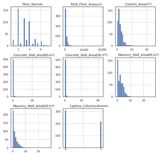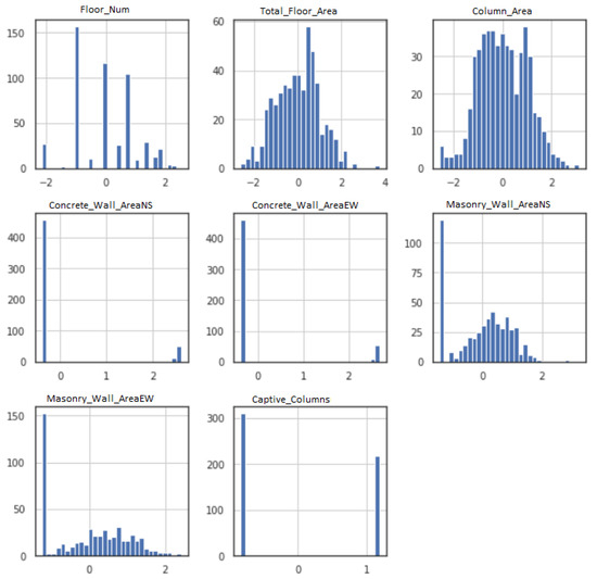 - Gaussian data—ML models function better when the data have Gaussian distribution. The Gaussian is a standard distribution with the familiar bell shape. Data fitting techniques can modify each variable to make the distribution Gaussian, or if not Gaussian, then more Gaussian-like. These transforms are most efficient when the data population is nearly Gaussian, to begin with, and is skewed or affected by outliers. Figure 2 shows the histogram for each feature input variable. Floor number has Gaussian-like distribution of the data points, whereas most of the features are skewed toward the left. The captive column obtained a binomial value (0 or 1); therefore, the data distribution is discrete.Figure 3 illustrates the data distribution for each feature input after employing Power-Transformer class from - library. Total floor area and column area show a better Gaussian bell shape, whereas masonry wall area NS and masonry wall area EW have some skewness on the left side. Due to very few non-zero data points, the area of concrete wall area NS and concrete wall area EW did not show any significant improvement.