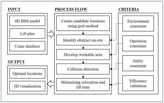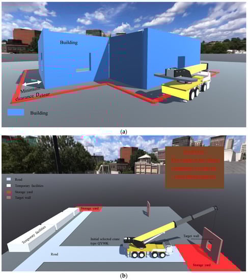 In terms of crane localization, three constraints (i.e., environmental constraint, operation constraint, and safety constraint) have mainly been considered in previous research. To deal with these constraints, different methods have been applied, which can be classified as the 2D-based method and the 3D simulation method. The 2D-based method uses mathematical formulas to calculate the feasible location areas or location points for a mobile crane. Although some methods consider spatial factors and establish 3D models, they are still based on the mathematical analysis of 2D drawings, thus being classified as a 2D-based method []. Lei [] and Ding [] obtained the appropriate location areas of a mobile crane by defining the outer boundary constraints of existing buildings or obstacles but without consideration of 3D spatial factors. Al-Hussein et al. [] judged whether a crane satisfied the environmental constraints by comparing the building coordinates around the proposed location points and calculating the distance between the crane boom and the building. Considering that a crane should be located in the center of all buildings, Olearczyk et al. [,] proposed a method for calculating the geometric center coordinates of all buildings and analyzed the maximum working radius of a crane and the distance between its boom and the buildings to ensure the operability and safety of lifting work. Moreover, Hermann et al. [] proposed another method to determine the location of mobile cranes in prefabricated building construction. First, a project manager defines a line and generates several random points on the line. Then, the distance between the center of each building and each random point is calculated to select the maximum distance for the random points, and finally, the above two steps are repeated to select the minimum distance from these maximum distances. The point with the minimum distance is the desired location point of the crane. Based on the 2D-based method, the feasible location area of the mobile crane is firstly obtained by considering its working radius or minimum operating distance. Then, other factors, including time and cost, are further considered to determine the optimal location point. However, this requires manual input of many parameters [,], which takes a significant amount of time, especially for complex spatial calculations. In addition, the accuracy of the obtained location points may be affected because some location points with collisions are not deleted while some feasible points are eliminated by mistake.