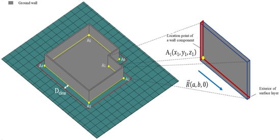 After generating the candidate points, a series of constraints are calculated to gradually remove the points that do not meet the requirements of the candidates; thus, a set of feasible points is obtained. The environmental constraint is tested first to define the boundaries of the buildings, temporary facilities, and main roads in the construction site, and then to eliminate the candidate points where the crane cannot be located to identify its feasible point set . For the buildings on the construction site, their flat coverage areas can be determined by the location of the ground walls. In IFC format BIM models, the location point of a wall component is the starting position of the wall in the longitudinal direction and in the transverse direction. According to the modeling choices in BIM, they may be located at the center line of the wall, that of the core layer, that of the surface layer, the interior/exterior of the surface layer, or that of the core layer. An example is shown in Figure 2. The location point is located exterior to the surface layer, and points A1 to A6 are the vertices of the walls W1-W6 of a certain building. For wall W1, the starting point coordinates A1, the direction , and the length L can be extracted from the IFC format BIM model, and the line of the wall W1 is expressed by Equation (2). Similarly, the pattern enclosed by the walls W1-W6 is represented by Equation (3):
