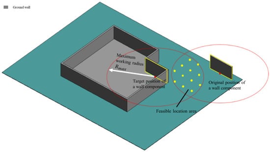 After the original and target positions of the building components are determined, for each component to be lifted, its original and target positions are taken, respectively, as the centers of two circles and the maximum working radius of the crane is the radius of the circles. As a result, the overlapping area of the two circles is obtained, i.e., the feasible location area of the crane. This is because the distance between any point in the overlapping area and the two centers is less than the maximum working radius of the crane. As an example, Figure 3 shows an intersection for lifting a wall component, involving feasible location points. By following the original feasible point set , the feasible point set for component can be obtained. By traversing all components, the original feasible points that do not belong to any feasible point set are eliminated to obtain a feasible point set . On the other hand, if the two circles do not intersect, meaning that the working radius of the crane does not meet the lifting requirements, the crane needs to be eliminated. Another crane with an increased load capacity would be loaded for the above constraint tests to be performed again.