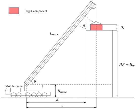The maximum working radius and the maximum boom length of the crane can be automatically determined by the following procedure. From small to large, the rated lifting capacity corresponding to a different working radius and boom length is invoked and compared with the maximum weight of the lifting components to check whether Equation (4) is satisfied. When under a certain boom length does not satisfy Equation (4), the comparison between the rated lifting weight of the next level of the boom length and the maximum weight starts, until the comparison of each level of the boom length is conducted. Based on this, the maximum working radius and the maximum boom length of the crane is determined: